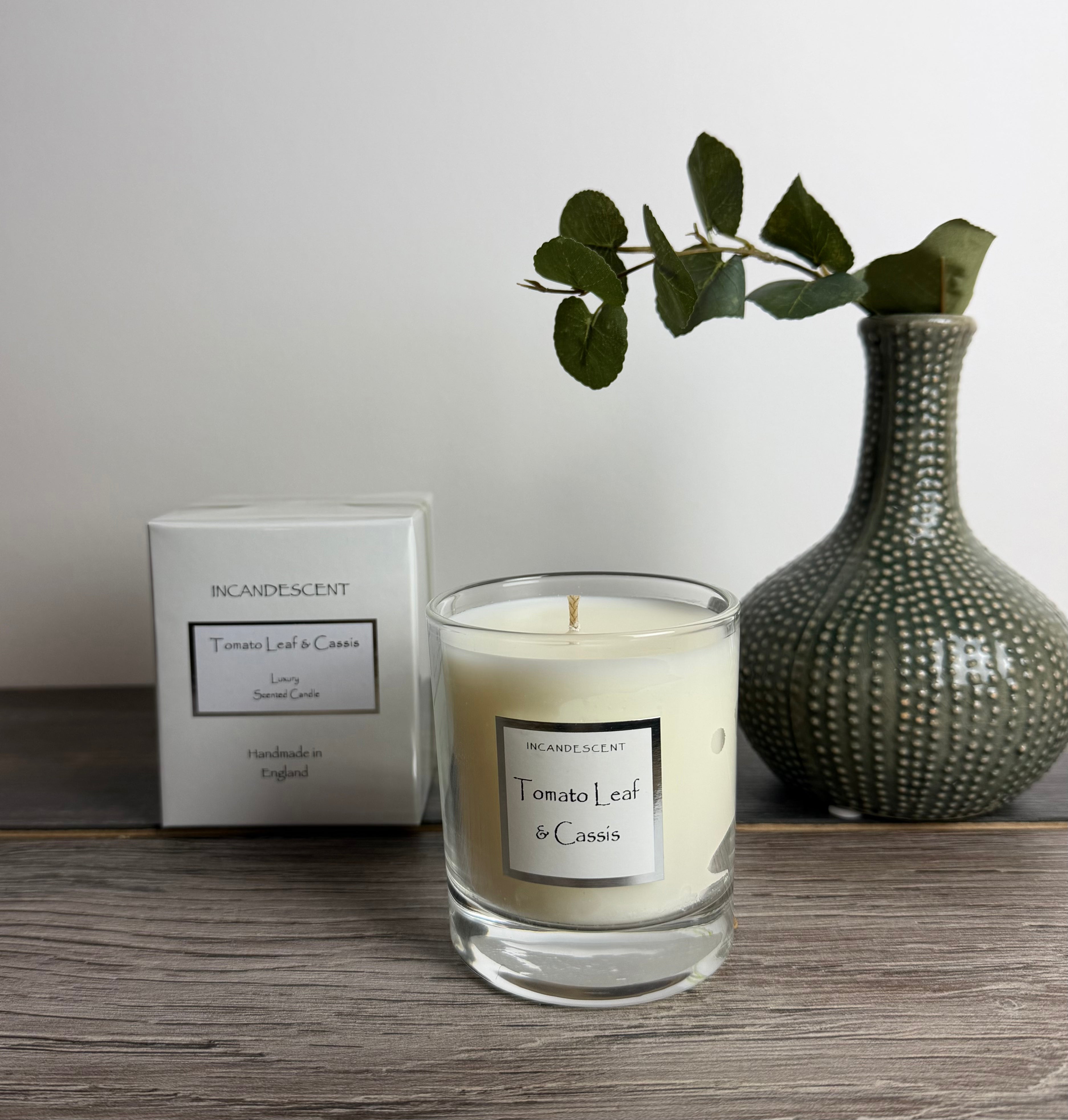 Elegant luxury single wick candle with tangy vine tomato leaves blended cassis, geranium and sandalwood.