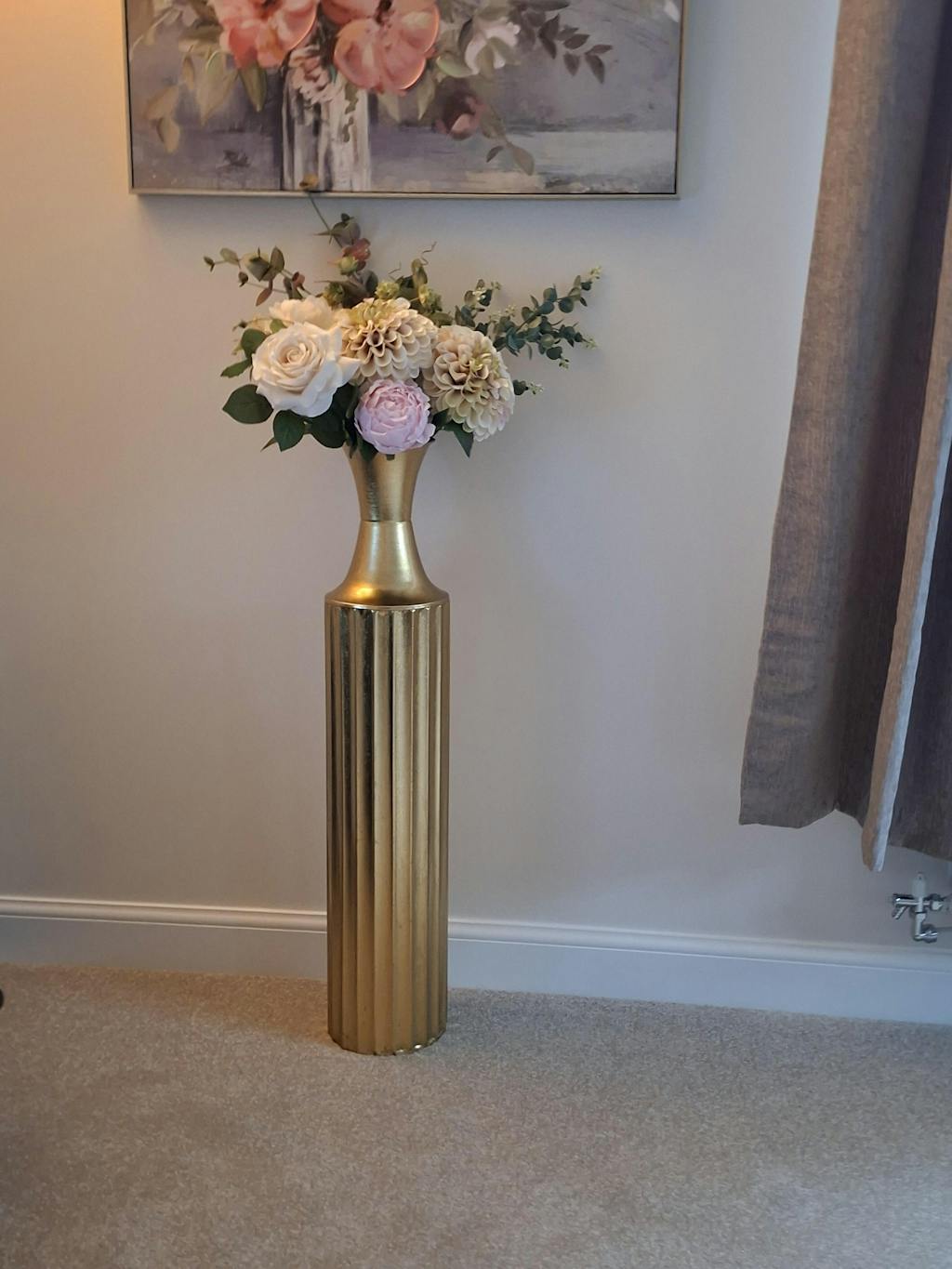 Tall and imposing this magnificent vase is crafted from metal and finished in a soft gold hue which captures the light beautifully. A grooved pattern wraps around the main body of the vase which tapers to a softer smooth finish at the top.