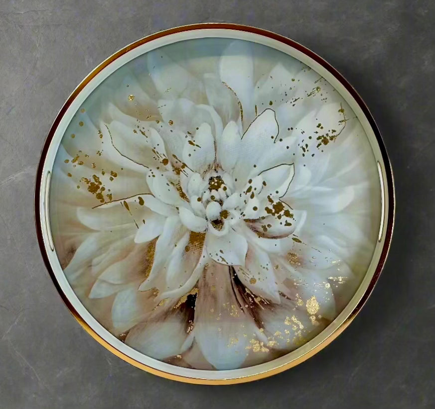 A ravishing bloom in warm whites with highlights of metallic gold creates the base of this elegantly chic tray.